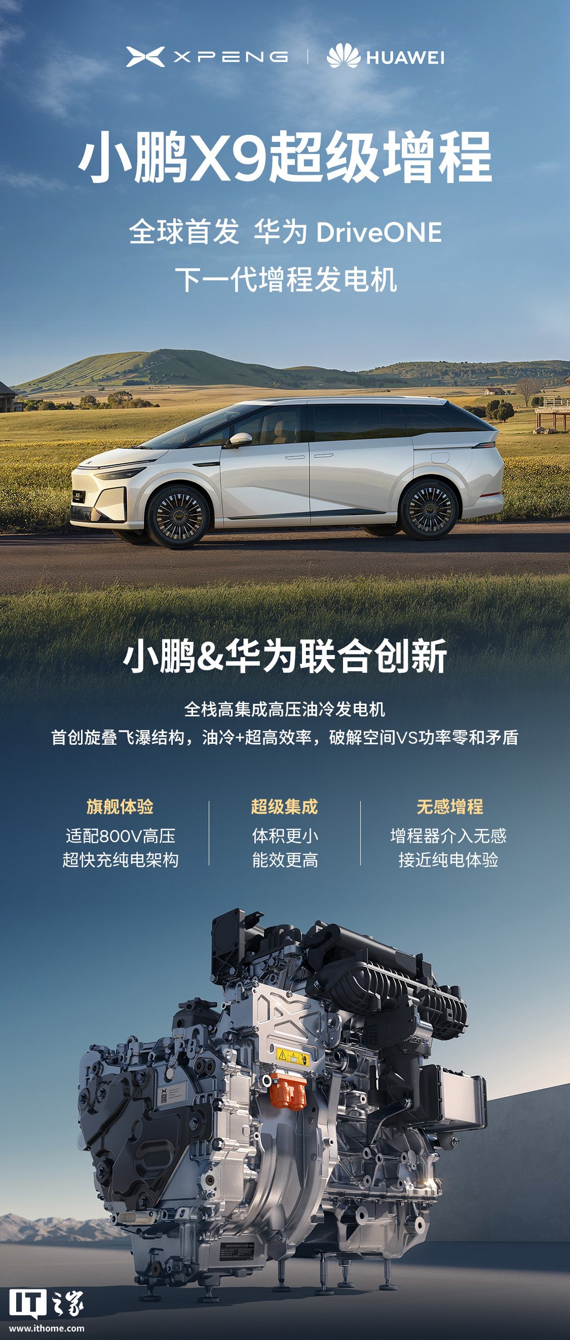 小鹏汽车表示,在小鹏 X9 超级增程研发之初,传统增程系统无法满足下一代增程大七座性能指标要求。行业现有增程解决方案,普遍存在补能效率受限、纯电续航不足、发电功率跟不上、NVH 表现难以媲美纯电等痛点。面对这一共同的技术挑战,在合作伙伴华为的共同研发下,小鹏 X9 超级增程全球首发了 DriveONE 全栈高集成高压油冷发电机。
